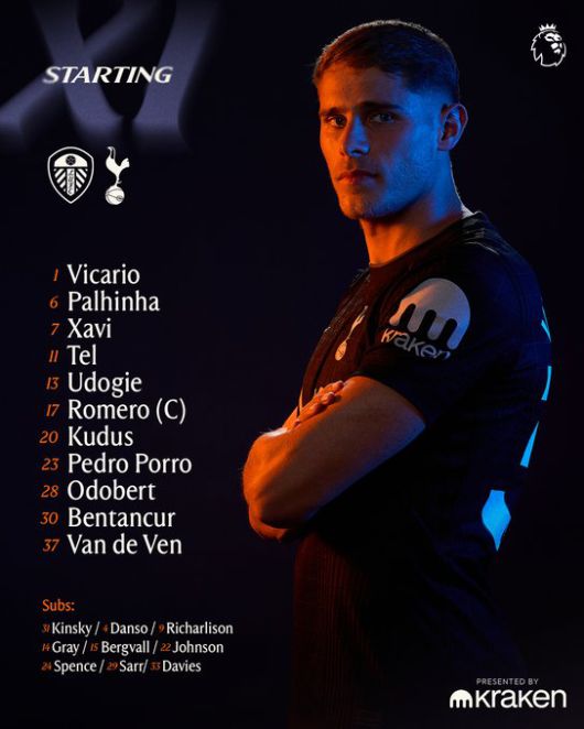 이에 맞서는 토트넘은 4-2-3-1 포메이션을 선택했다. 굴리엘모 비카리오가 골문을 지켰고, 데스티니 우도기, 미키 판더펜, 크리스티안 로메로, 페드로 포로가 백4를 구축했다. 주앙 팔리냐와 로드리고 벤탄쿠르가 3선에서 공수를 연결했다. 2선에는 윌송 오도베르, 사비 시몬스, 모하메드 쿠두스가 배치됐다. 최전방 원톱으로는 마티스 텔이 이름을 올렸다.