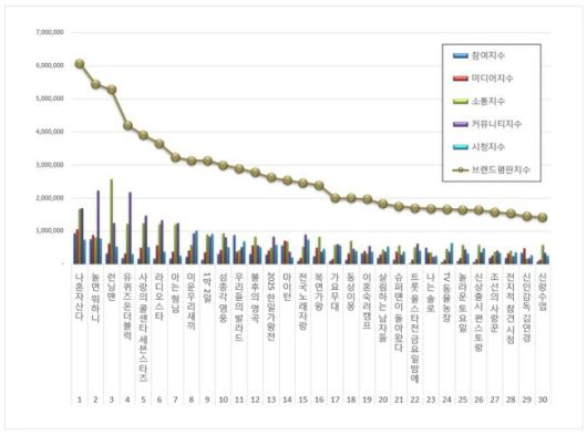 2025년 10월 예능 프로그램 브랜드평판 30위 순위는 나혼자산다, 놀면 뭐하니, 런닝맨, 유퀴즈온더블럭, 사랑의 콜센타 세븐스타즈 , 라디오스타, 아는 형님, 미운우리새끼, 1박 2일, 섬총각 영웅, 우리들의 발라드, 불후의 명곡, 2025 한일가왕전 , 마이턴, 전국노래자랑, 복면가왕, 가요무대, 동상이몽, 이혼숙려캠프, 살림하는 남자들, 슈퍼맨이 돌아왔다, 트롯 올스타전 금요일밤에, 나는 솔로, TV 동물농장, 놀라운 토요일, 신상출시 편스토랑, 조선의 사랑꾼, 전지적 참견 시점, 신인감독 김연경, 신랑수업 순으로 분석됐다.