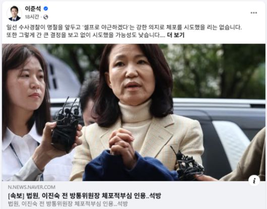 이 대표는 4일 페이스북에 이 전 위원장이 법원의 체포적부심 인용으로 석방된 뉴스를 링크하고 “일선 수사경찰이 명절을 앞두고 ‘셀프로 야근하겠다’는 강한 의지로 체포를 시도했을 리는 없다”며 “그렇게 간 큰 결정을 보고 없이 시도했을 가능성도 낮다”고 지적했다.
