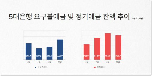 5일 금융권에 따르면 KB국민·신한·하나·우리·NH농협 등 5대 시중은행의 9월 말 기준 요구불예금(MMDA 포함) 잔액은 669조7238억원으로 전월(643조7084억원)보다 26조154억원 증가했다. 한 달 만에 26조원이 넘는 자금이 유입된 것은 이례적인 규모로, 올해 들어 요구불예금이 30조원 가까이 변동된 달은 2번에 그친다.