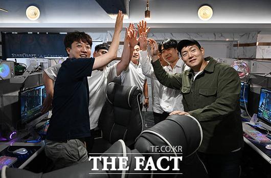 이준석 개혁신당 대표(가운데)와 김재섭 국민의힘 의원이 추석 명절을 하루 앞둔 5일 오후 서울 영등포구의 한 PC방에서 열린 한가위 기념 스타크래프트 게임대회 '스타 정치인'에 참가해 파이팅을 외치고 있다. /임영무 기자 |