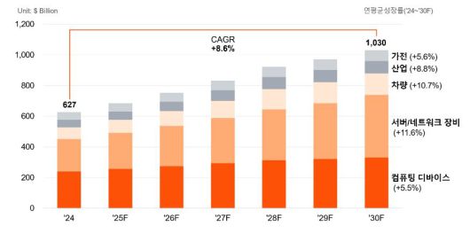 보고서에 따르면 반도체 시장은 2024년부터 2030년까지 연평균 8.6% 성장해 1조 달러를 돌파할 것으로 예상된다. 특히 서버·네트워크 장비와 자동차 부문이 가장 빠르게 확대될 전망이다. 자율주행 기술 발전, 데이터 트래픽 급증, 가전 시장의 AI·사물인터넷(IoT) 융합, PC와 스마트폰의 온디바이스 AI 적용이 맞물리며 신경망처리장치(NPU), 그래픽처리장치(GPU) 등 AI 가속기가 수요 성장을 이끌 것으로 분석됐다.