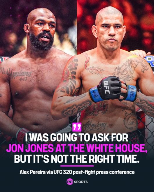 페레이라는 “내가 진짜 원하는 건 슈퍼파이트다. 헤비급에서 싸우고 싶다. 모든 상황과 존중을 고려할 때, 원래는 백악관 대회에서 존스와의 맞대결을 요청하려고 했다. 하나, 최근 일어난 일을 생각하면 지금은 때가 아닌 것 같다”며 “그래도 내가 원하는 건 슈퍼파이트다. 백악관에서 존스와 싸우는 것, 그게 바로 슈퍼파이트다”라고 강조했다.