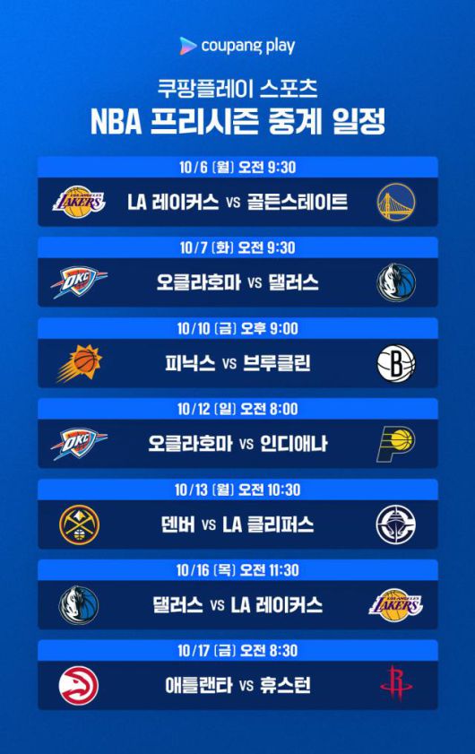 쿠팡플레이가 추석 연휴부터 2025-26 미국프로농구협회(NBA) 프리시즌 주요 경기를 한국어로 독점 생중계한다.