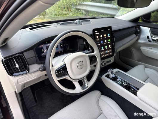 실내에 발을 들여놓는 순간 스웨덴 브랜드다운 미니멀리즘 디자인이 강하게 다가온다. 물리 버튼을 최대한 줄이고 11.2인치 세로형 인포테인먼트 디스플레이에 대부분 기능을 통합했다. 기존 9인치에서 확대된 디스플레이는 선명도와 터치 반응성 모두 만족스럽다. 티맵 오토를 새롭게 적용해 내비게이션과 음성인식 기능의 완성도가 높아졌다. 신형 시스템은 기존 대비 약 2배 빨라졌다고 한다.