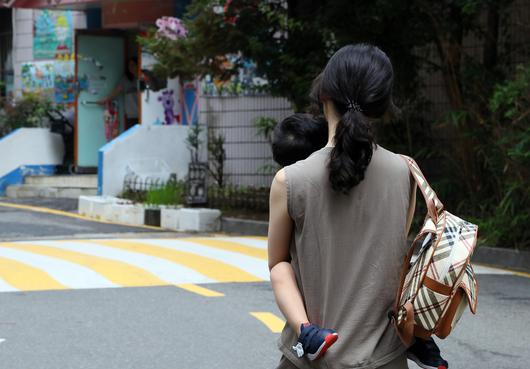 서울 한 아파트단지에서 한 엄마가 아이를 안고 어린이집으로 향하고 있다. 연합뉴스 |