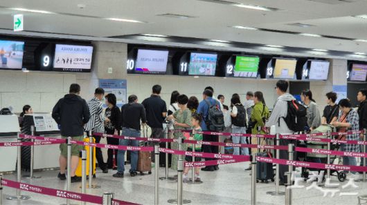 셀프 체크인 키오스크와 휴대폰 유심칩을 교환하는 창구 앞에도 승객들이 줄 지어 섰다. 키오스크를 통해 체크인을 마친 승객들은 수하물 수속이 시작되자 몸집만 한 캐리어를 이끌고 모여들기 시작했고, 대기 줄이 끊임없이 이어졌다.