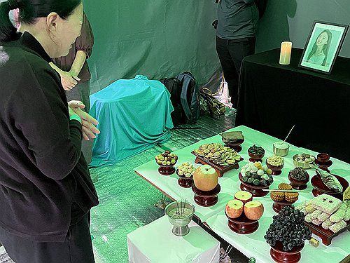 (서울=연합뉴스) 최윤선 기자 = 추석인 6일 서울 마포구 상암동 MBC 본사 앞에서 지난해 직장 내 괴롭힘을 호소하며 숨진 기상캐스터 오요안나 씨 추모 공간에서 모친 장연미 씨가 눈물을 흘리고 있다. 2025.10.6
