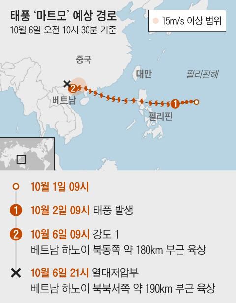 마트모는 6일 오전 5시 현재 광시좡족자치구를 통과하며 최대 풍속 초속 23m 수준의 ‘열대성 폭풍(Tropical Storm)’으로 세력이 약화됐다. 그러나 북서쪽으로 이동하면서 남부 내륙 지역인 윈난성, 구이저우, 쓰촨 분지 등지에 집중 호우가 이어질 것으로 예보됐다. 인접 국가인 베트남 기상청 역시 북부 지역에 폭우와 강풍, 그리고 홍수 발생 가능성을 경고했다.