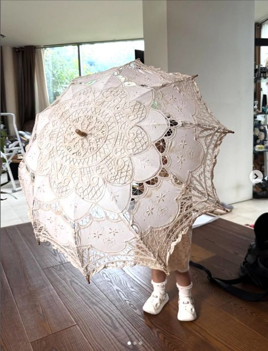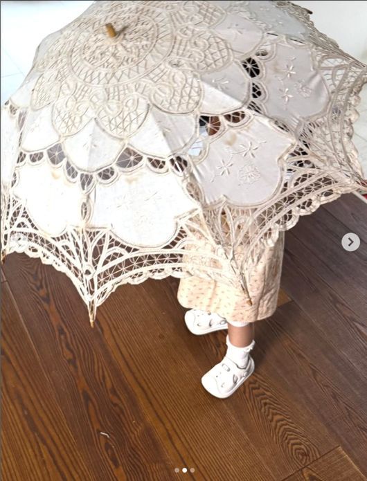 공개된 사진에는 이민정과 이병헌 부부의 딸인 서이의 모습이 담겨 있었다. 서이는 화려한 레이스 무늬의 흰색 양산을 펼쳐 들고 있었다. 작은 몸집과 얼굴이 양산 안에 쏙 들어가 서 있는 두 발만 나와 있지만, 사랑스러운 자태로 시선을 끌었다.