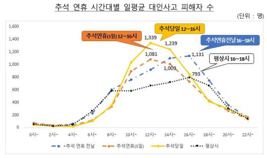 추석 연휴 시간대별 일평균 대인사고 피해자 수. 보험개발원·손해보험협회 제공 |