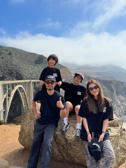 서진 속 가희는 남편과 두 아들과 함께 해외에서 여유로운 시간을 보내고 있다. 네 가족은 모두 같은 문구가 새겨진 블랙 티셔츠로 맞춰 입고 단란한 분위기를 자아냈다.