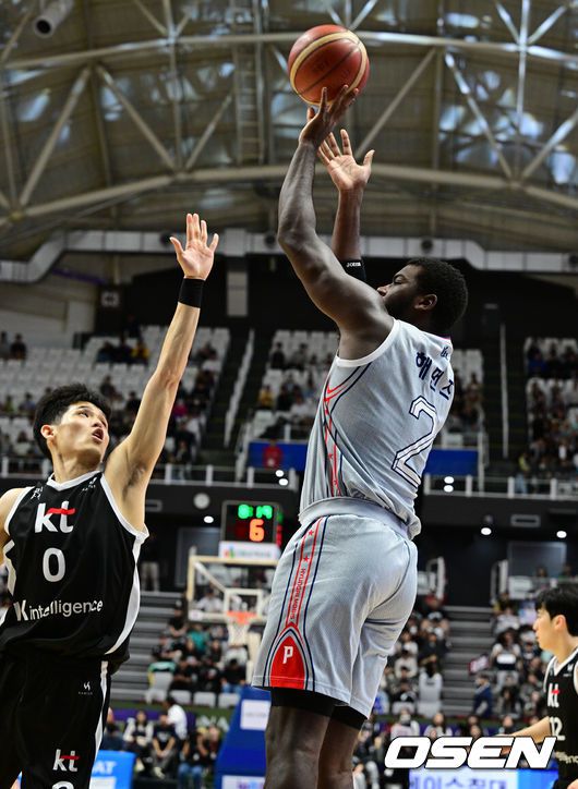 [OSEN=수원, 조은정 기자]7일 오후 서수원칠보체육관에서 2025-2026 LG전자 프로농구 수원 KT 소닉붐과 울산 현대모비스 피버스의 경기가 열렸다. 수원 KT와 울산 현대모비스는 나란히 1승 1패를 기록 중이다. 1쿼터 현대모비스 해먼즈가 슛을 성공하고 있다. 2025.10.07 /cej@osen.co.kr