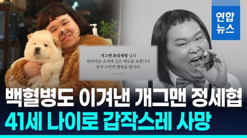 (서울=연합뉴스) 강아지 캐릭터 '차우차우'로 인기를 얻었던 개그맨 정세협이 지난 6일 밤 41세 나이로 세상을 떠났습니다.