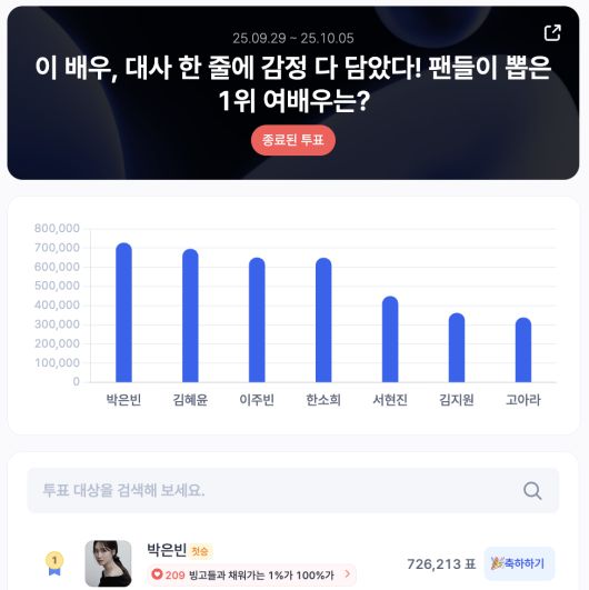 [스타데일리뉴스=서태양기자] 지난 9월 29일부터 10월 5일까지 진행된 디시트렌드 주간 투표 '이 배우, 대사 한 줄에 감정 다 담았다! 팬들이 뽑은 1위 여배우는?' 결과, 배우 박은빈이 726,213표를 획득하며 첫 1위를 차지했다.
