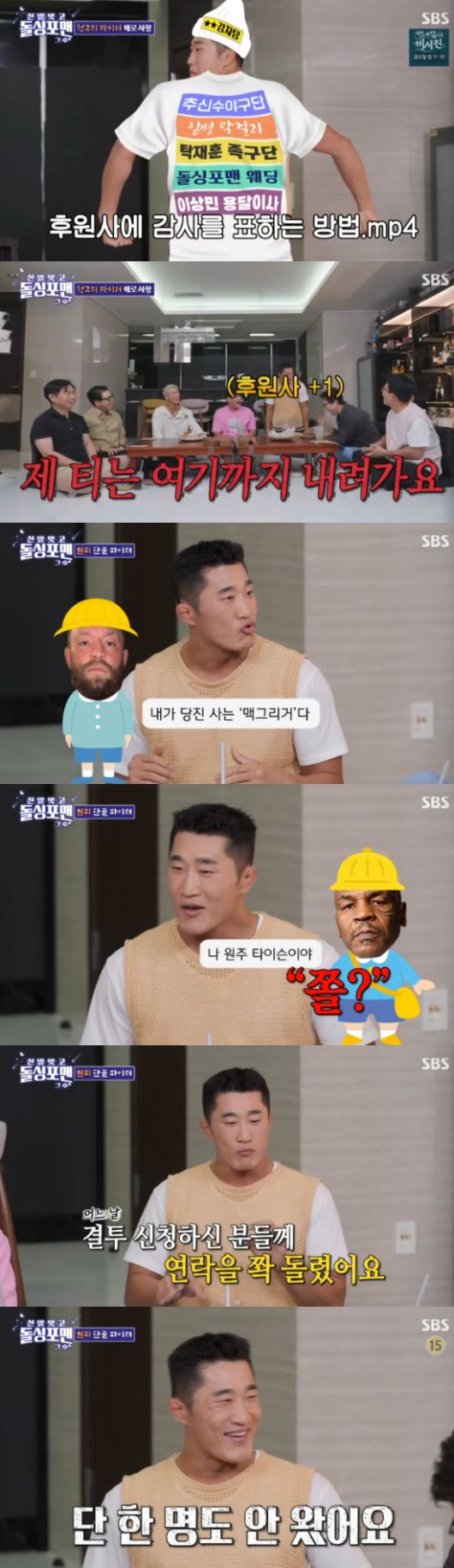 또 김동현은 은퇴했지만 결투 신청이 DM으로 엄청 온다면서 "본인이 당진 맥그리거, 원주 타이슨이라면서 한판 붙자는 메시지가 많이 온다. 그래서 30명 정도 모아서 '스파링을 가볍게 해보자'면서 연락을 했다. 격투기 채널에서 소개하려고. 근데 한 명도 안 오더라"고 말해 웃음을 줬다.