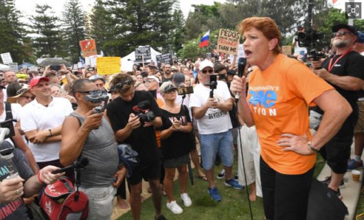 원 네이션 대표인 폴린 핸슨 상원의원이 2021년 11월 호주 퀸즐랜드 골드코스트에서 열린 코로나19 백신 의무 접종 반대 시위에 참석해 연설하고 있다./EPA 연합뉴스 |