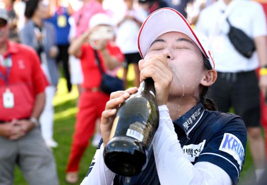 우승 뒤 이탈리아 스파클링 와인 프로세코 빌라 산디를 마시는 황유민. AFP연합뉴스 |