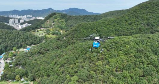 드론이 물품함을 안양 병목안 시민공원으로 이동하고 있다.[사진=안양시] |