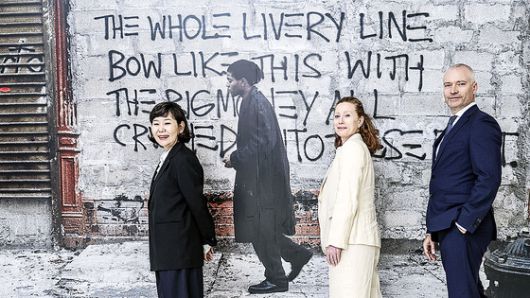 바스키아 특별전 총괄감독인 이지윤 숨 프로젝트 대표(왼쪽부터)와 안나 카리나 호프바우어, 디터 부흐하르트가 지난달 18일 서울 동대문디자인플라자(DDP)의 바스키아 사진 앞에서 포즈를 취했다. 김성룡 기자 |