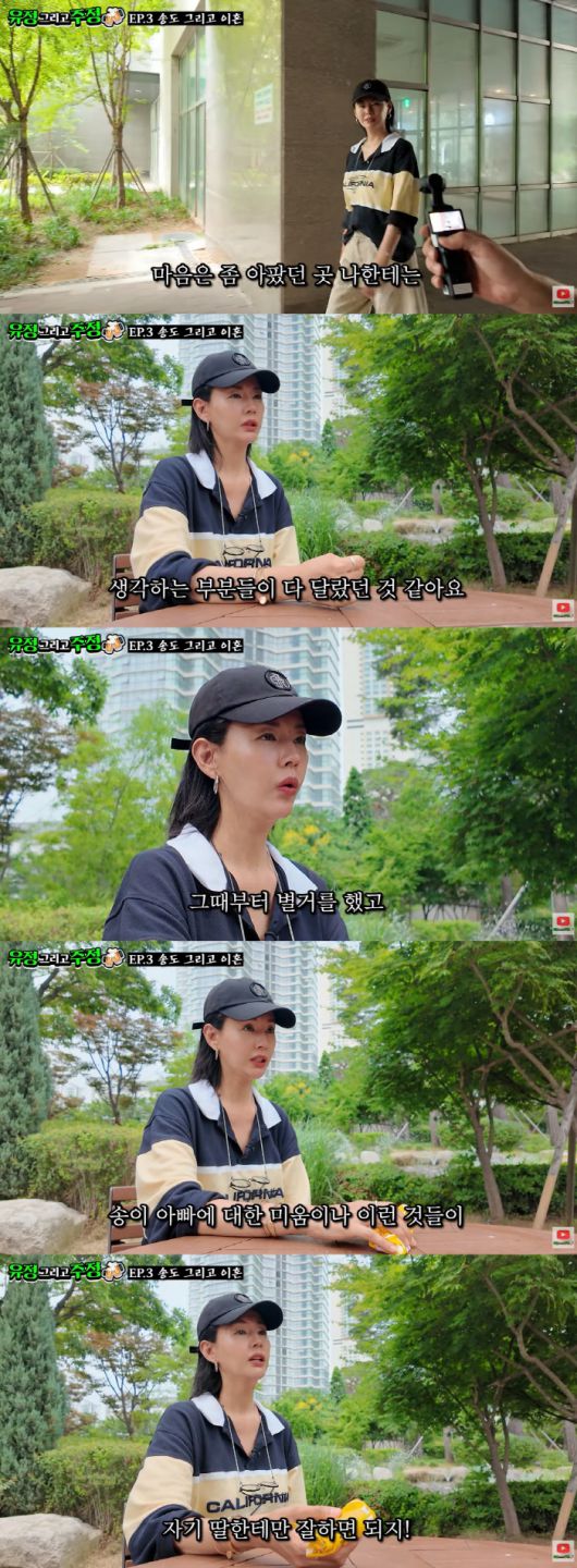 서유정은 "나와의 관계고 문제였지 송이는 아빠가 필요하고 좋다. 이 사람이 나한테는 안 좋은 사람일 수 있지만 어떤 누군가한테는 좋은 사람일 수도 있지 않냐. 나도 마찬가지다. 그런 것처럼 이 사람은 나쁜 사람이 아니다. 그냥 나랑 타이밍이 안 맞았을 뿐이고 나랑 너무 맞지 않았을 뿐인 건지 이 사람이 기본적으로 나쁜 사람은 아니었다고 생각한다"며 "아빠는 좋은 사람이고 송이한테는 최선을 다하려고 하는 사람이다. 나한테 못하면 어떠냐. 자기 딸한테만 잘하면 된다. 그런 생각을 가지면서 나도 마음이 많이 편안해진 거 같다"며 눈물을 보였다.
