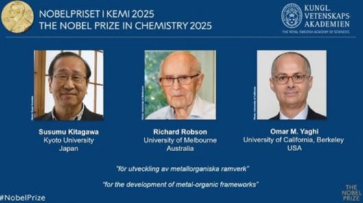 스웨덴 왕립과학원 노벨위원회는 8일(현지시간) "금속·유기 골격체(MOF·Metal-Organic Frameworks)를 개발한 공로로 일본 교토대의 기타가와 스스무 교수, 호주 멜버른대의 리처드 롭슨 교수, 미국 UC버클리의 오마르 M. 야기 교수를 2025년 노벨화학상 공동 수상자로 선정했다"고 발표했다.