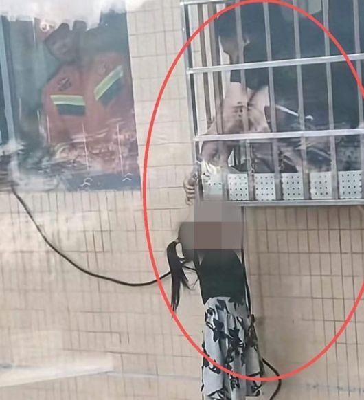 여성은 창문 밖으로 몸을 내밀어 아이의 손을 잡았고, 16세 아들에게 경찰과 소방에 신고하라고 소리쳤다.