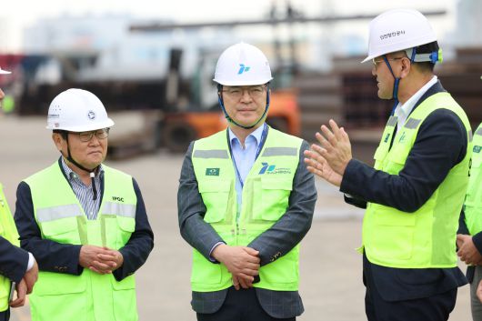 문신학(가운데) 산업통상부 차관이 9일 인천 연수구  인천신항내 선광신컨테이너터미널에 방문,  수출 상황을 점검하고 있다. [산업통상부 제공]