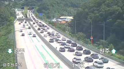 아직 차량이 가다 서기를 반복하는 수준은 아니지만, 양방향 모두 아침보다 눈에 띄게 차량이 늘어난 모습입니다.