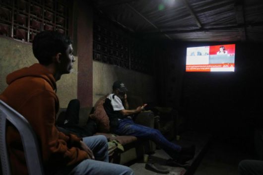 팔레스타인 주민들이 9일(현지 시간) 가자지구 중부 데이르알발라의 알아크사 병원 밖 천막에서 이스라엘과 하마스가 ‘가자 평화 구상’ 1단계에 합의했다는 내용의 TV 뉴스를 시청하고 있다. /AP=뉴시스 |