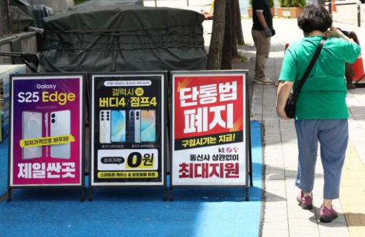 지난 7월 21일 서울 한 휴대폰 판매점 앞에 '단통법 폐지'라고 적힌 안내판이 놓여 있다. |
