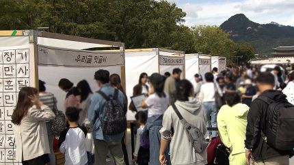 서울시는 광화문광장 세종대왕상 앞에서 '한글, 세상을 잇다'를 주제로 한글 맞춤법과 띄어쓰기 등 우리말 문제 풀이 행사를 진행하고 있습니다.