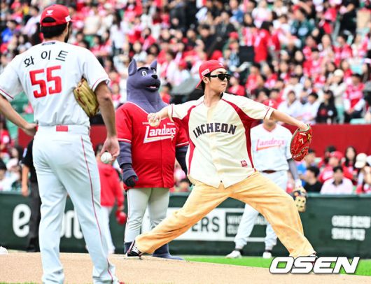 [OSEN=인천, 지형준 기자] 9일 인천 SSG랜더스필드에서 2025 신한 SOL뱅크 KBO리그 준플레이오프(5전 3선승제) 1차전 SSG 랜더스와 삼성 라이온즈의 경기가 열렸다. SSG은 화이트, 삼성은 최원태를 선발 투수로 내세웠다. 경기에 앞서 배우 최현욱이 시구를 하고 있다. 2025.10.09 /jpnews@osen.co.kr
