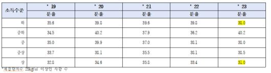 서미화 더불어민주당 국회의원(보건복지위원회 ) 이 질병관리청과 국민건강보험공단으로부터 제출받은 자료에 따르면 소득수준이 높을수록 비만 발병률은 낮았다. 2023 년 기준, 소득 하위 20% 의 비만 발병률은 38% 였고 상위 20% 는 31% 로 양 계층 간 7%포인트 차이를 보였다. 비만의 대표 지표인 허리둘레 역시 저소득층의 기준 이상 비율이 고소득층보다 4.9% 높았다.