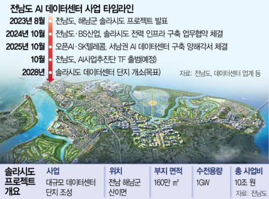 전남도 내부에선 오픈AI 데이터센터의 최적 입지(立地)로 해남군에 들어선 ‘솔라시도’를 낙점지은 상태다. 전남도와 해남군은 해남군 산이면 160만 ㎡(약 50만 평) 부지에 1GW(기가와트) 규모의 데이터센터 단지를 조성하는 중인데 이 사업의 이름이 솔라시도다.