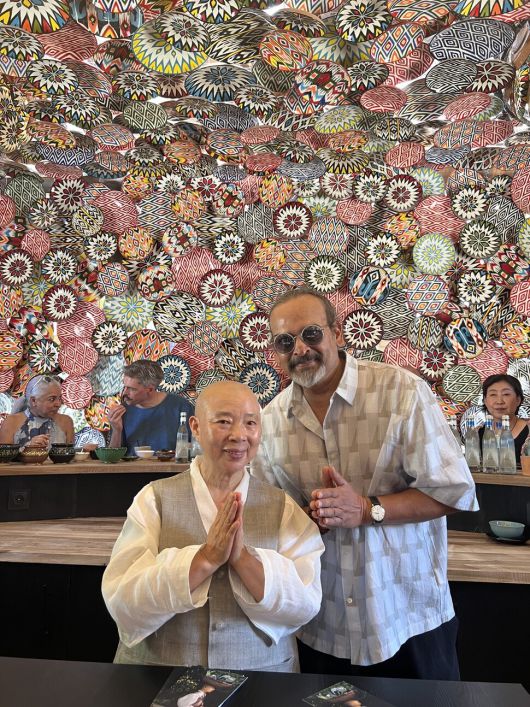 지난달 9일 수보드 굽타 작가의 식기 설치 공간에서 음식 협업을 펼친 정관 스님과 굽타 작가. 오경순씨 제공 |