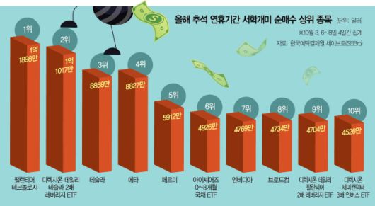 9일 한국예탁결제원에 따르면 10월 3일과 6~8일(4일) 동안 한국 투자자들의 미국 주식 순매수액은 약 7억 3000만 달러(약 1조 390억 원)로 집계됐다. 지난해 추석 연휴(9월 16~18일) 3일간 순매수액 410만 달러(약 58억 원)에 비해 무려 180배 가까이 증가한 수준이다.