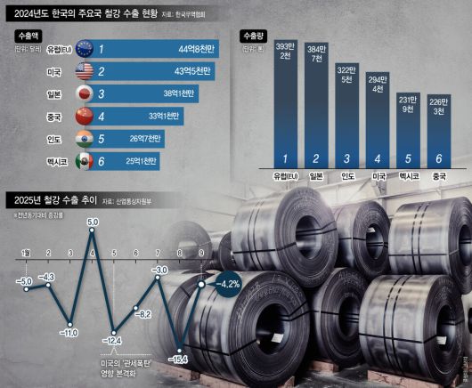 미국에 이어 유럽도 철강 무역 장벽을 높이면서 한국은 큰 충격을 받을 수 밖에 없는 상황에 놓였다. 한국무역협회 자료를 보면 지난해 한국이 유럽연합과 미국에 수출한 철강 제품은 각각 44억8000만 달러(약 6조3000억원)과 43억5000만 달러(약 6조1000억원) 규모로 1, 2위를 차지했다. 한국의 철강 수출은 올해 들어 미국의 ‘관세 폭탄’ 영향이 본격화 하면서 내리막길을 걷고 있다.