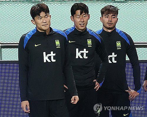 (서울=연합뉴스) 김성민 기자 = 대한민국 축구 국가대표팀 김민재(왼쪽)와 손흥민(가운데)이 9일 서울월드컵경기장에서 공식 훈련을 하고 있다. 2025.10.9
