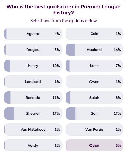 프리미어리그 사무국이 공개한 투표 현황에서 시어러와 호날두 등이 선두권을 유지했고 손흥민, 홀란이 그 뒤를 맹추격하는 양상이 빚어졌다.
