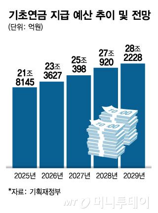 이에 따라 기초연금 예산도 앞으로 급증한다. 정부예산안을 보면 기초연금 예산은 △2027년 25조398억원 △2028년 27조920억원 △2029년 28조2228억원 등으로 늘어날 전망이다.