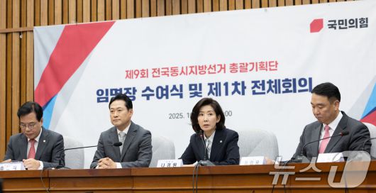 (서울=뉴스1) 이승배 기자 = 나경원 국민의힘 지방선거 총괄기획단 위원장이 10일 서울 여의도 국회에서 열린 제1차 전체회의에서 모두발언하고 있다. 2025.10.10/뉴스1photolee@news1.krCopyright ⓒ 뉴스1. All rights reserved. 무단 전재 및 재배포, AI학습 이용 금지.