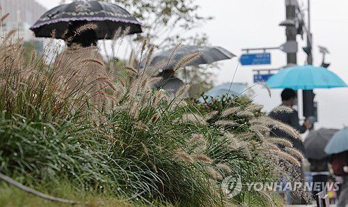 (서울=연합뉴스) 김인철 기자 = 황금연휴가 끝나고 비가 내리는 10일 서울 광화문광장 세종대로 사거리 인근 수크령에 가을비가 맺혀있다. 2025.10.10