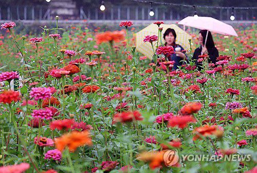 (서울=연합뉴스) 10일 강원도 평창읍 평창강 일원에서 열린 2025 평창 백일홍축제를 찾은 방문객들이 가을비를 맞으며 백일홍 꽃밭을 걷고 있다. 2025.10.10 [평창군 제공. 재판매 및 DB 금지]