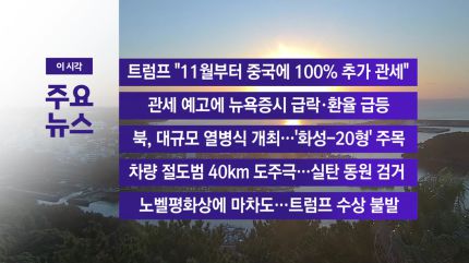 ■ 트럼프 "11월부터 중국에 100% 추가 관세" ■ 관세 예고에 뉴욕증시 급락·환율 급등 ■ 북, 대규모 열병식 개최…'화성-20형' 주목 ■ 차량 절도범 40km 도주극…실탄 동원 검거 ■ 노벨평화상에 마차도…트럼프 수상 불발 [저작권자(c) YTN 무단전재, 재배포 및 AI 데이터 활용 금지] 유일하게 AI가 대체 못 하는 직업? 대한민국 24시간 뉴스채널 [YTN LIVE] 보기 〉