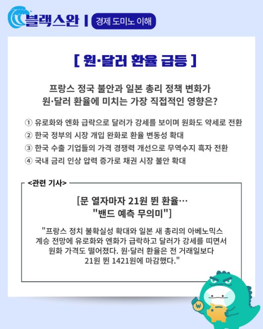 - 핵심 요약: 원·달러 환율이 10일 코스피 급등에도 불구하고 5개월여 만에 1420원대로 치솟았다. 이날 서울 외환시장에서 달러화 대비 원화 환율은 전 거래일(2일) 주간 거래 종가(오후 3시 30분 기준)보다 21원 뛴 1421원에 마감했다. 이는 종가 기준 올 4월 30일(1421원) 이후 가장 높은 수준으로 상승 폭도 4월 7일(33.7원) 이후 가장 크다. 이러한 원화 약세는 미국 연방정부의 ‘셧다운(부분 업무정지)’, 프랑스 정국 불안, 엔화 급락 등 연휴 기간의 여러 변수가 한꺼번에 반영된 결과로 보인다.