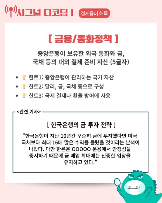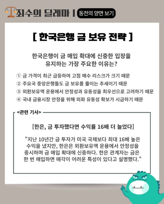 - 핵심 요약: 한은이 지난 10년간 금에 투자했다면 미 국채보다 최대 16배 높은 수익을 올렸을 것이라는 분석이 나왔다. 입법조사처에 따르면 2016년 초 1억 원을 미국 국채(1년물)에 투자해 매년 재투자했을 시 올 9월 말 기준 잔액은 1억 4108만 원으로 증가했다. 같은 기간 금에 투자했다면 4억 7623만 원으로 늘었으며 국채 70%, 금 30% 혼합 투자는 2억 4163만 원으로 추정됐다. 순수익 기준으로 보면 금 단독 투자는 미 국채 대비 약 9.2배, 혼합 투자는 약 3.5배 높은 수준이다. 2014년 이후 한은이 금을 사들이고 있지 않는데 가격이 상승하고 있는 금 매입을 늘렸다면 더 높은 수익률을 올렸을 것으로 보인다.