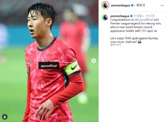 프리미어리그 사무국은 11일(한국시간) 공식 사회관계망서비스(SNS)를 통해 "137번째 A매치에 나서며 한국 남자 대표팀 최다 출전 기록을 경신한 토트넘 홋스퍼와 프리미어리그의 레전드 손흥민에게 축하를 보낸다"라면서 2020 푸스카스상을 수상한 번리전 70m 질주 골 영상을 함께 게시했다.