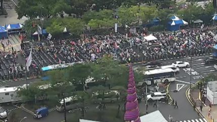 보수단체 집회가 본격적으로 시작됐고, 집회 구역 차선이 철제 울타리로 통제된 가운데 옆으로는 차량이 가변차로로 오가는 모습도 보입니다.