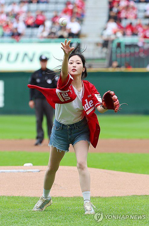 (인천=연합뉴스) 임순석 기자 = 11일 인천 SSG랜더스필드에서 열린 2025 프로야구 KBO리그 포스트시즌 준플레이오프 2차전 삼성 라이온즈와 SSG 랜더스의 경기. 배우 최희진이 시구를 하고 있다. 2025.10.11